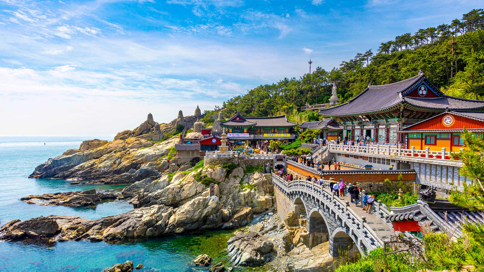 En matinée, visite du village culturel de Gamcheon, classé à l’UNESCO. Il s’agit d’un quartier de maisons aux couleurs pastel semblant se superposer les unes sur les autres, séparées par des ruelles labyrinthiques et abruptes. Il a été créé dans les années 1950 lorsque les réfugiés de la guerre de Corée se sont installés dans la région. Des jeunes artistes ont redoré son image depuis 2009 grâce à des peintures murales. Descente vers la baie de Busan pour rejoindre son site emblématique, le marché aux poissons de Jagalchi, le plus grand dédié aux produits de la mer en Corée. Vous serez fascinés par l’incroyable diversité d’espèces marines qui y sont représentées.