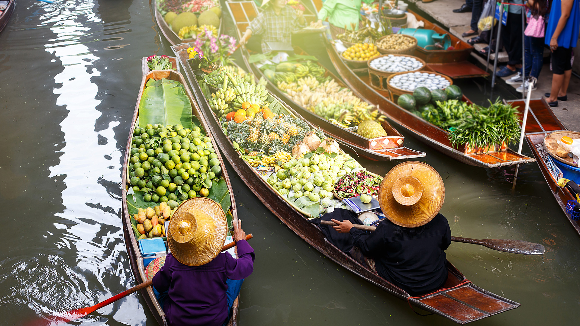 Ce matin, départ en direction du captivant village de Damnoen Saduak. En route, arrêt dans une fabrique de noix de coco avec dégustation de kanom krok. À destination, balade en pirogue sur les canaux du marché flottant, où vous contemplerez les maisons sur pilotis ainsi que l’activité locale des habitants avec leurs embarcations chargées de fruits et de légumes. Poursuite vers un autre site étonnant : le fameux marché sur les rails de Mae Klong. Ce marché alimentaire, installé directement sur les voies ferrées, se replie à l’approche du train, pour se réinstaller aussitôt celui-ci passé ! Temps libre pour le dîner, puis retour à Bangkok et balade dans le quartier chinois, l’un des plus anciens de la ville, foisonnant de produits exotiques. Vous terminerez la journée au Pak Khlong Talad, le marché aux fleurs emblématique de Bangkok : un véritable festival de couleurs et de parfums. PD