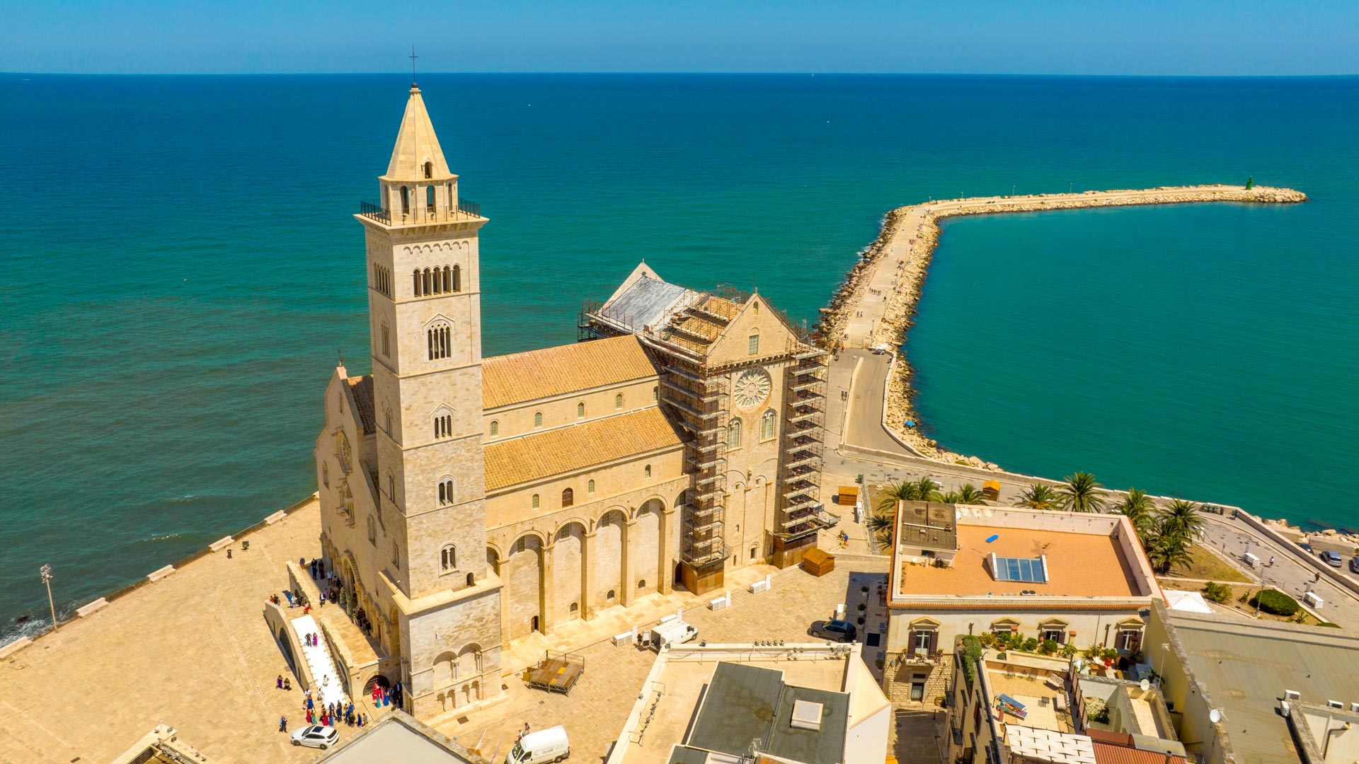 En matinée, prise d’une navette et visite de Castel del Monte, le château symbolisant la puissance de Frédéric II de Souabe. Avec son épaisse structure octogonale, il s’agit d’un exemple éloquent d'architecture médiévale. La rigueur mathématique et astronomique de sa planimétrie, qui adopte le chiffre huit comme ligne directrice et son positionnement visant à créer des symétries de lumière particulières lors des jours de solstice et d'équinoxe, créent un symbolisme qui passionne les experts depuis des siècles. En après-midi, visite guidée de la ville de Trani reconnue pour son élégante cathédrale de style roman surélevée en bord de mer. Elle a été construite en utilisant le tuf calcaire extrait des carrières de la ville. Retour à Bari. PD/D