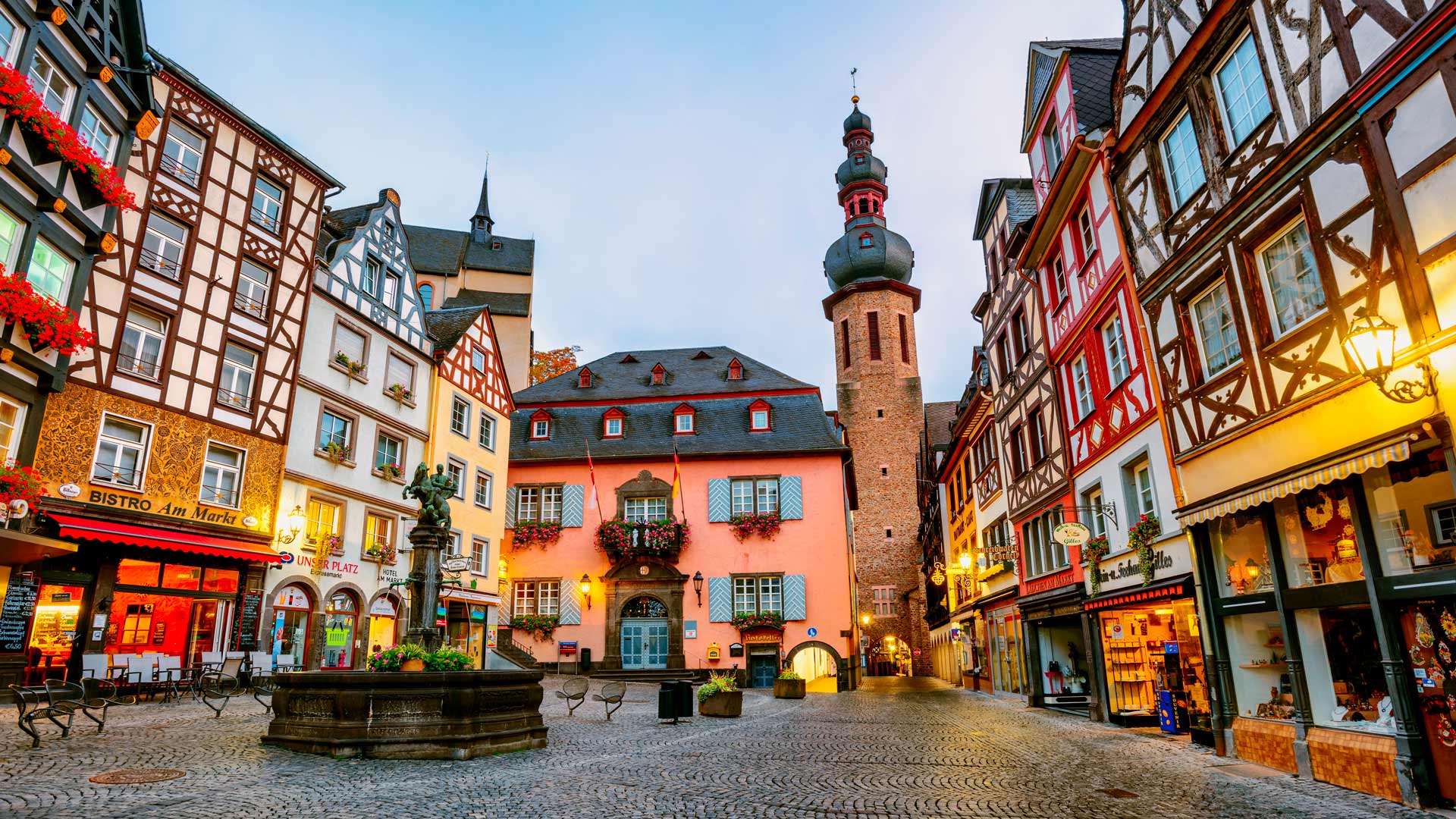 Située au cœur de la vallée de la Moselle, cette région riche en vignobles est particulièrement connue pour le Riesling, un cépage blanc qui gagne de plus en plus en popularité. Prenez part à une visite à pied de Bernkastel. Votre guide local francophone vous expliquera l’architecture locale et culturelle durant cette visite des sites incontournables de la ville. Vous visite vous mènera entre autres au cœur des maisons à colombages parfaitement préservées ainsi qu’à la Rathaus, soit l’hôtel de ville de Bernkastel au style Renaissance. Profitez ensuite de temps libre avant de rejoindre votre bateau. Navigation vers Coblence. PD/D/S